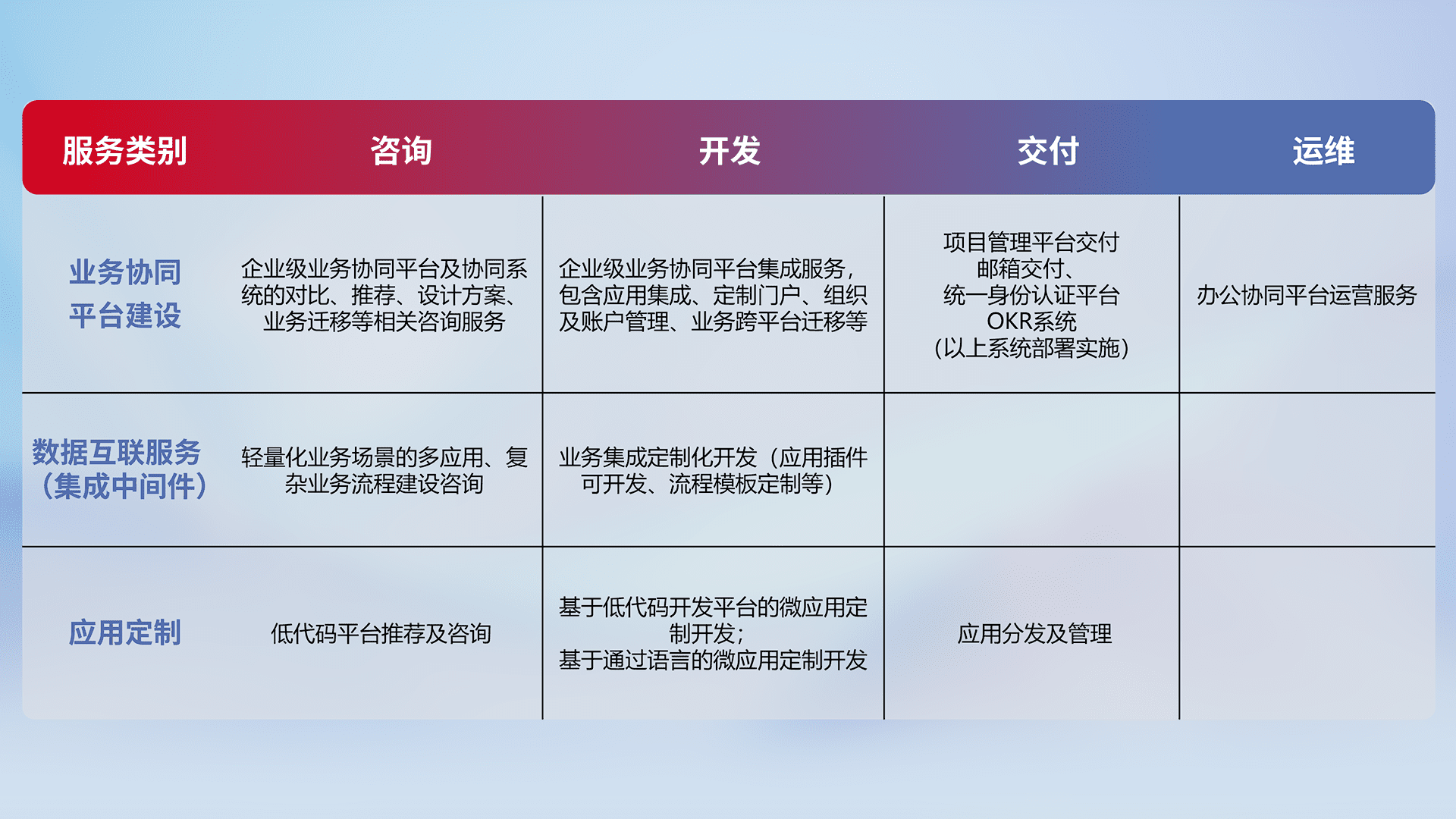 针对钉钉、、、、企微、、、、IDaas等平台级产品提供产品的规划、、方案、、交付、、定制化开发等服务,,实现如统一协同办公、、智能客户服务、、、混合会议管理、、智能数据查询、、等业务场景,,,,实现数字化转型。。