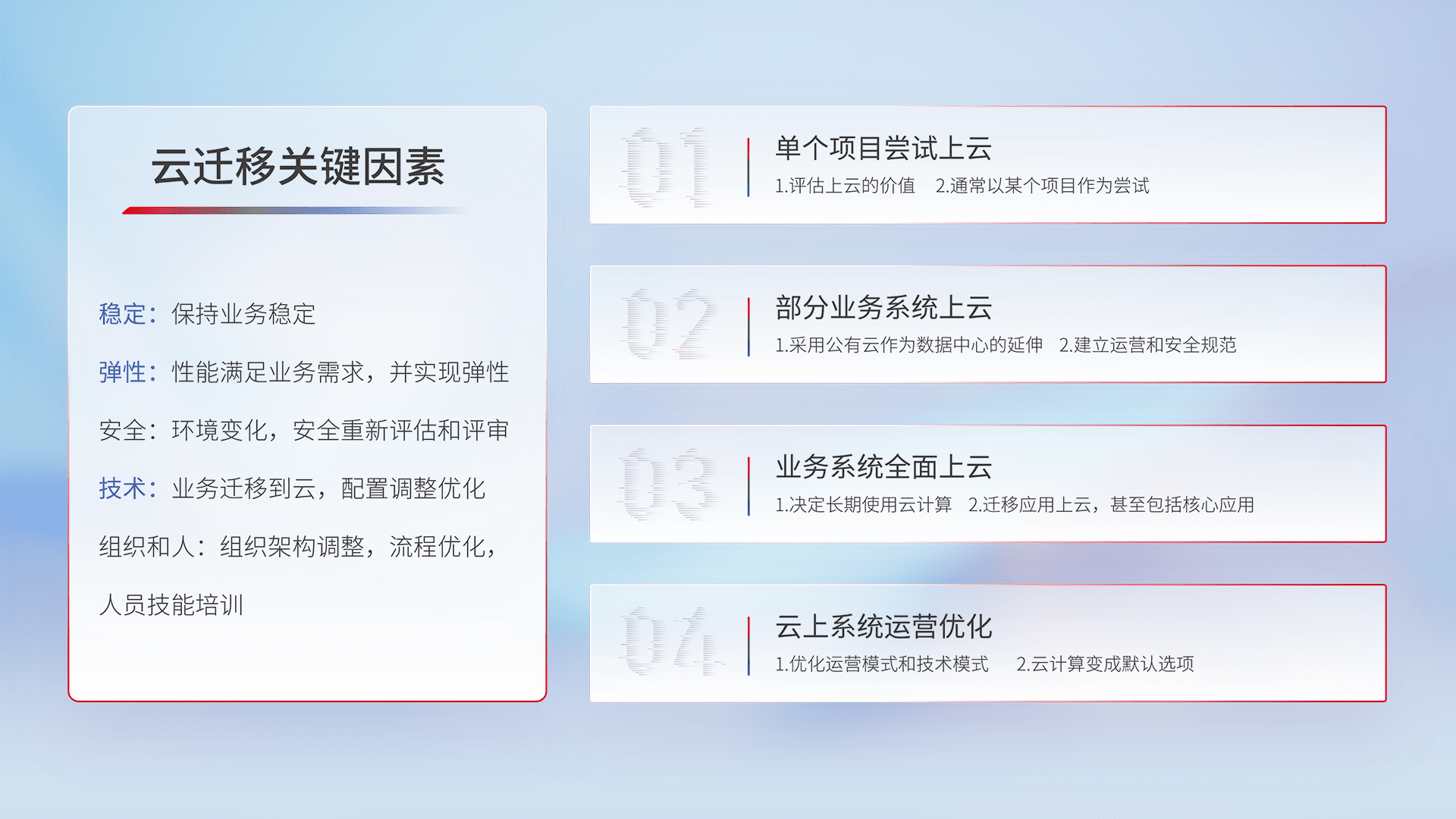 结合实际业务,,,,从规划设计、、云平台选型、、云原生改造、、数据迁移、、、、集成交付,,,迁移全过程为客户识别最佳上云路径,,做好风险识别管理,,,设计网络架构、、、、身份权限、、、、安全审计合规、、操作审计、、、日志审计、、、、监控告警策略、、多站点容灾设计等,,,,对云上基础设施进行整体规划,,,提升IT治理水平,,以满足弹性、、高可用、、、高性能的需求。。