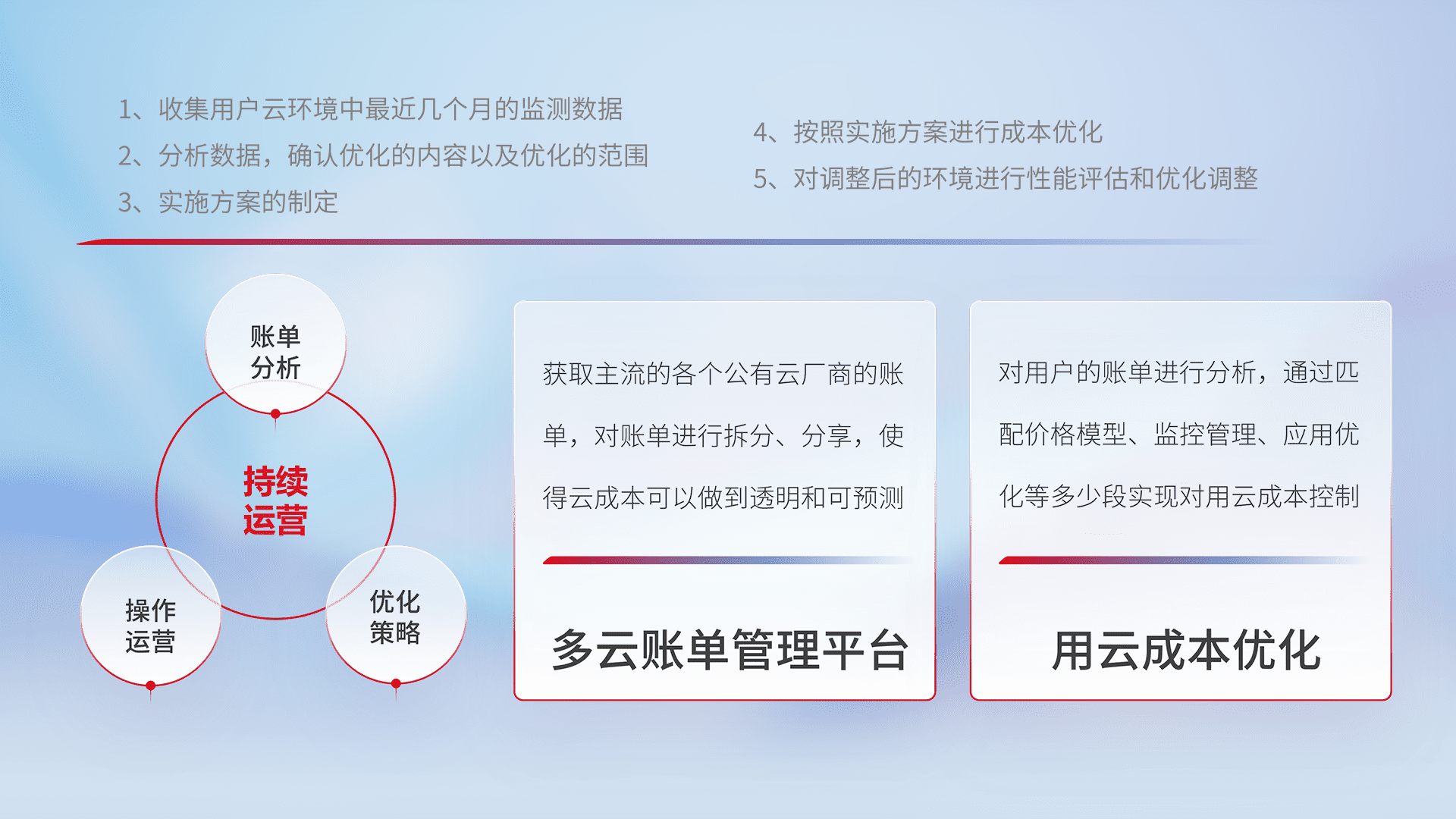 通过多云纳管,,,以统一的资源数据模型把客户的云资源进行抽象和封装,,,进而实现对多云资源的统一操作,,,,保障云资源管理的可靠性、、、稳定性与可用性。。。。量身定制化运维内容,,配置、、、开发运维、、补丁管理、、备份、、、监控、、、认证和访问管理、、、、审计和日常巡检等,,保障在用云过程中的可靠度,,,稳定度以及高可用率。。。。